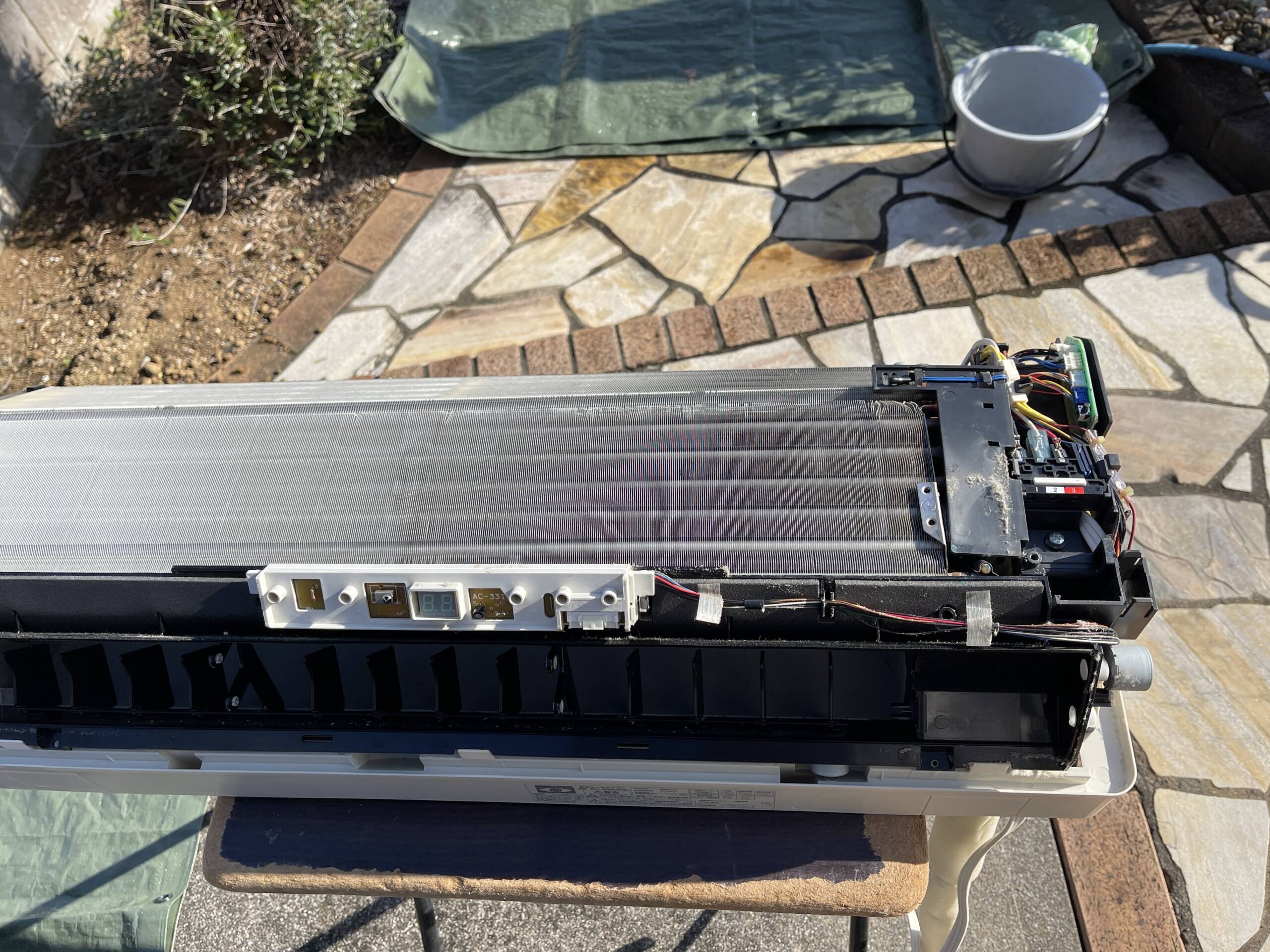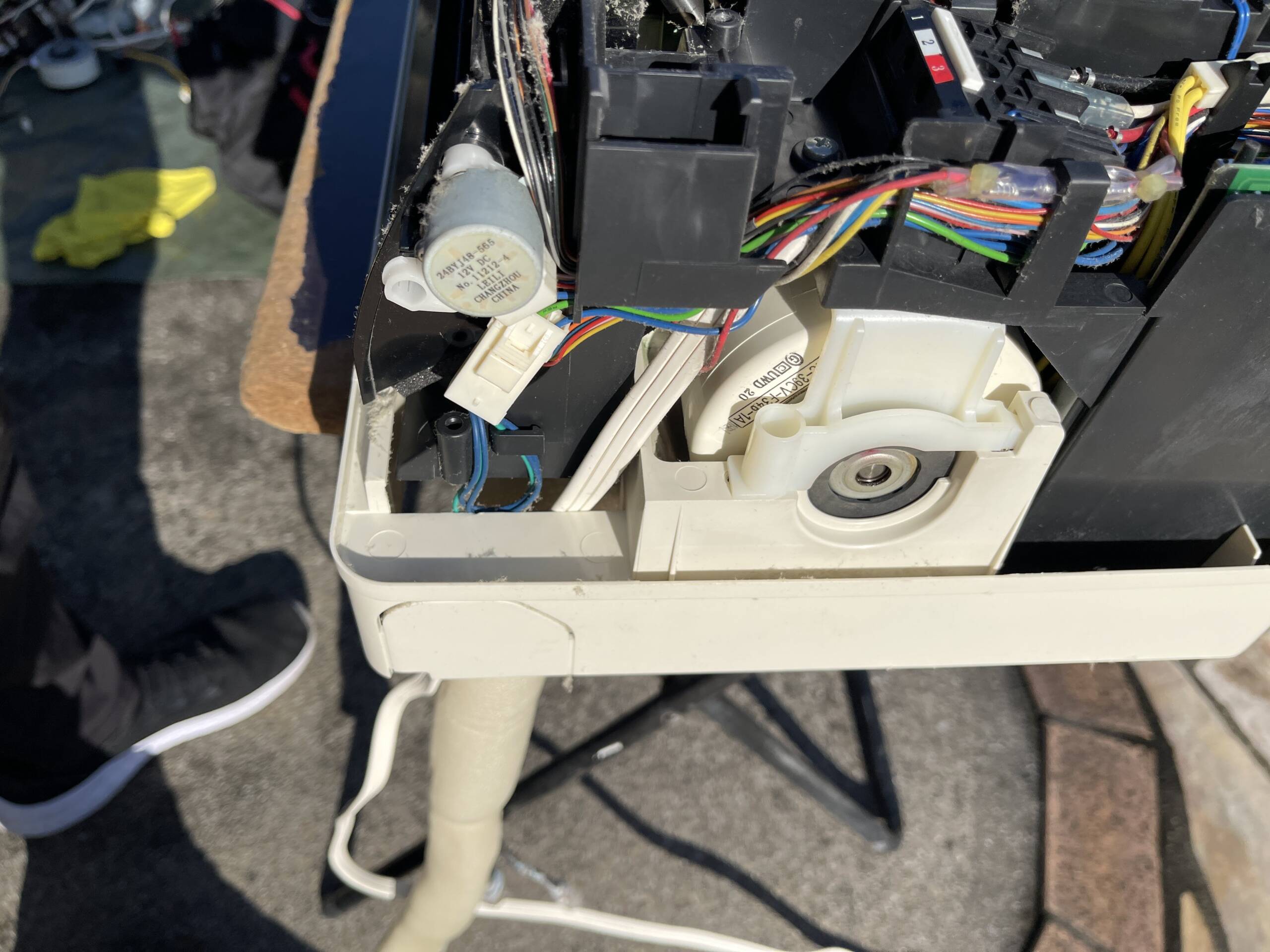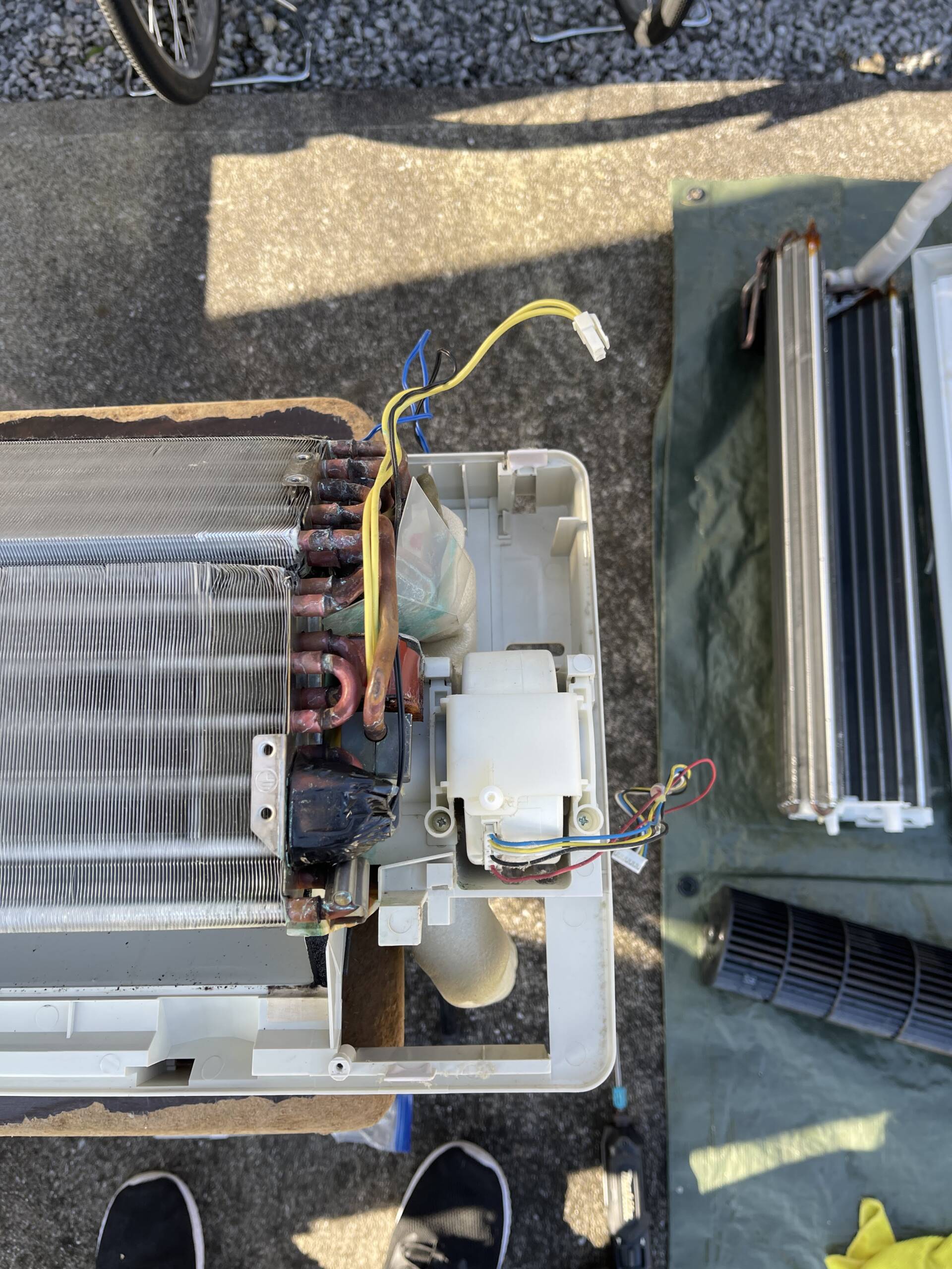 室内機の取り外しから、電装部品・送風ファン・熱交換器・ドレンパンまでを分解し、